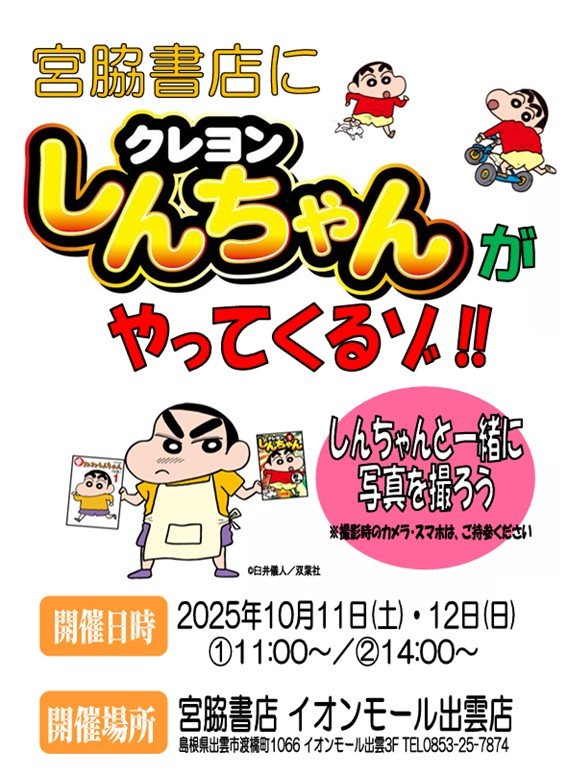 10/11(土)・12(日)宮脇書店イオンモール出雲店にクレヨンしんちゃんがやってくる‼